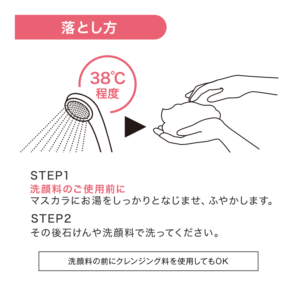 汗・水・皮脂・こすれに強く、にじみにくいのに、ぬるま湯でふやかした後、洗顔料で洗って落とせます。