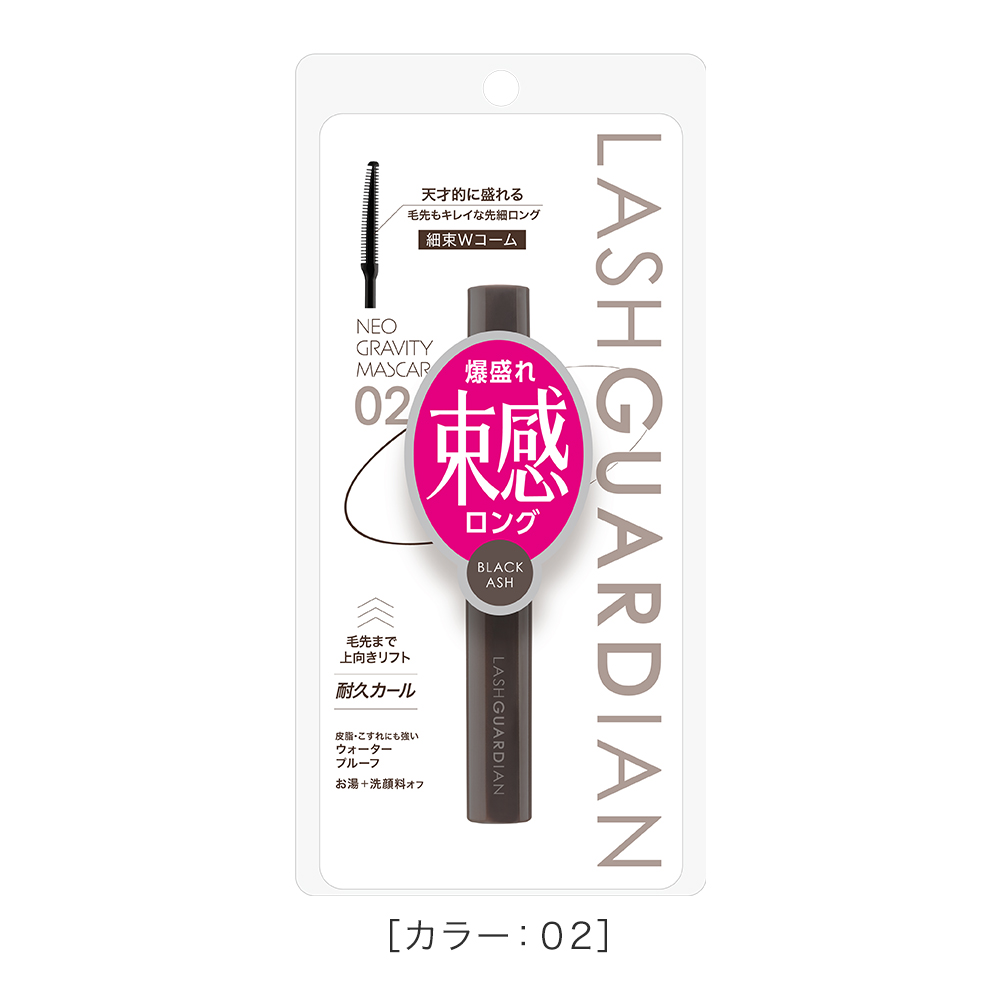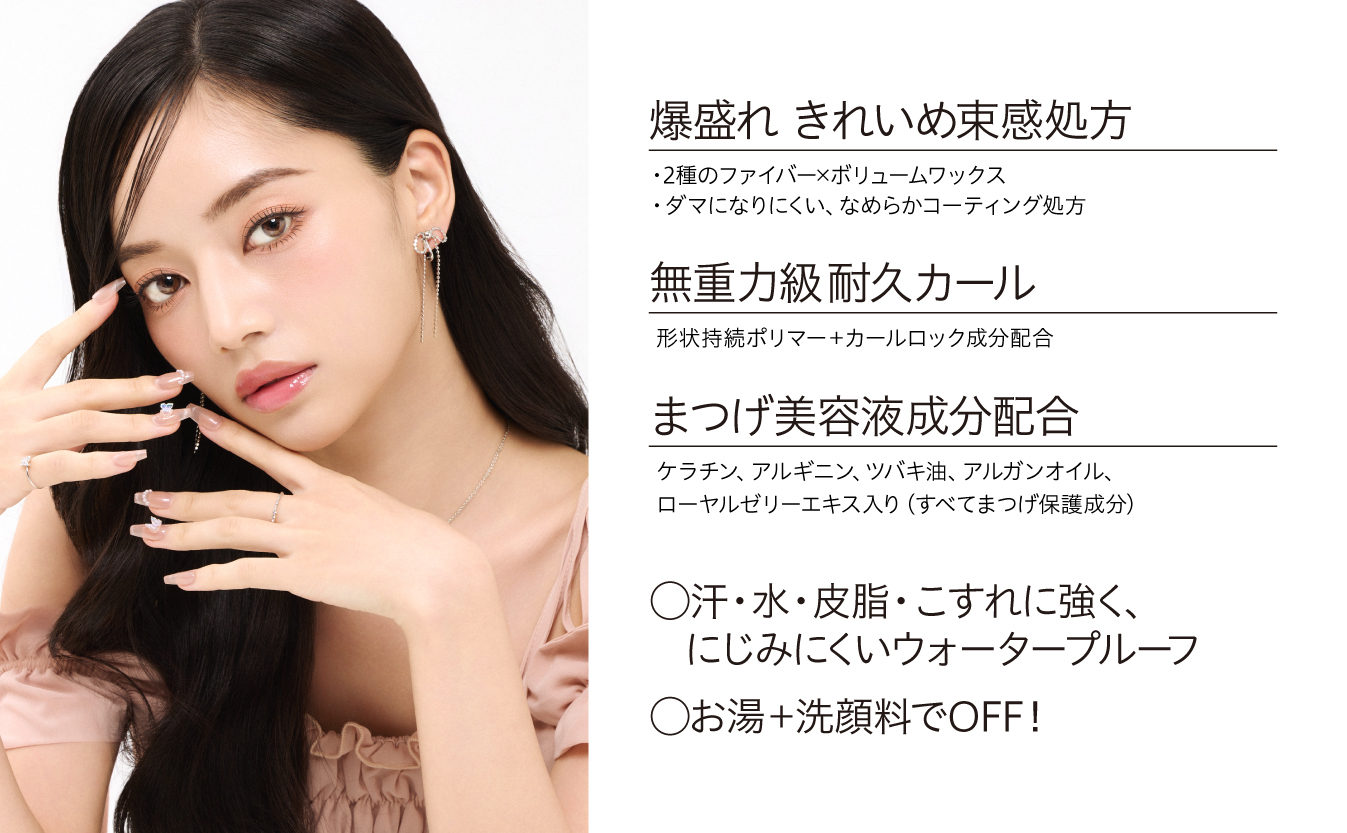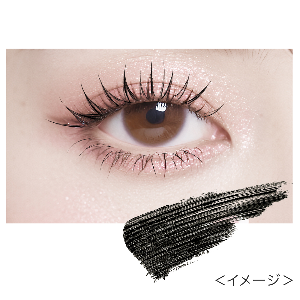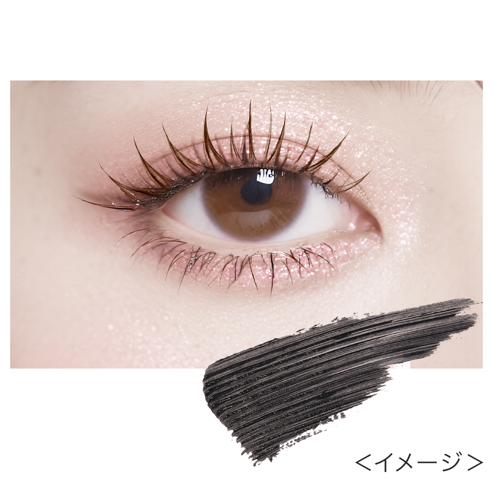 ボリュームワックスと2種の繊維配合で爆盛れまつげに仕上げ、形状持続ポリマーとカールロック成分が無重力級上向きまつげをキープします。