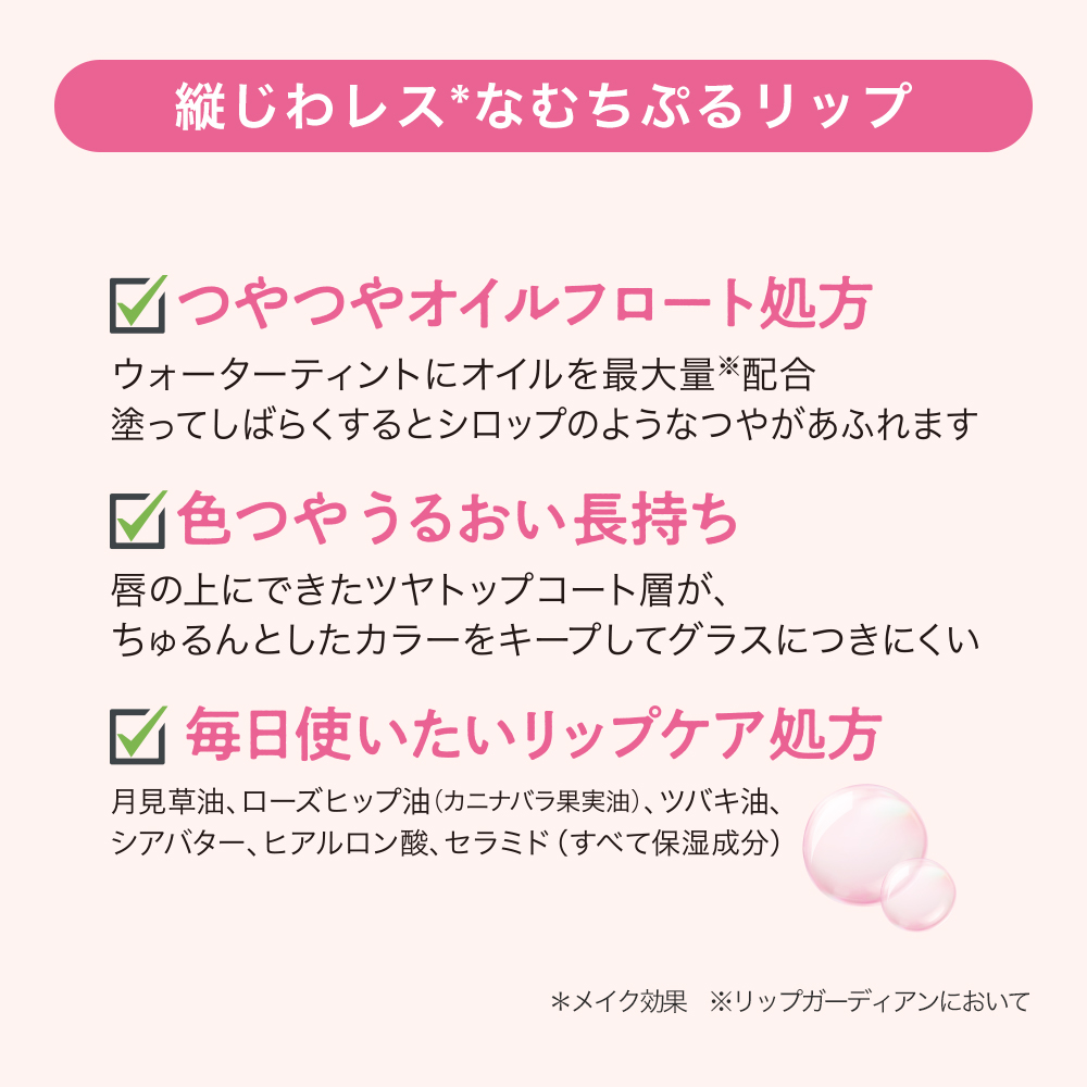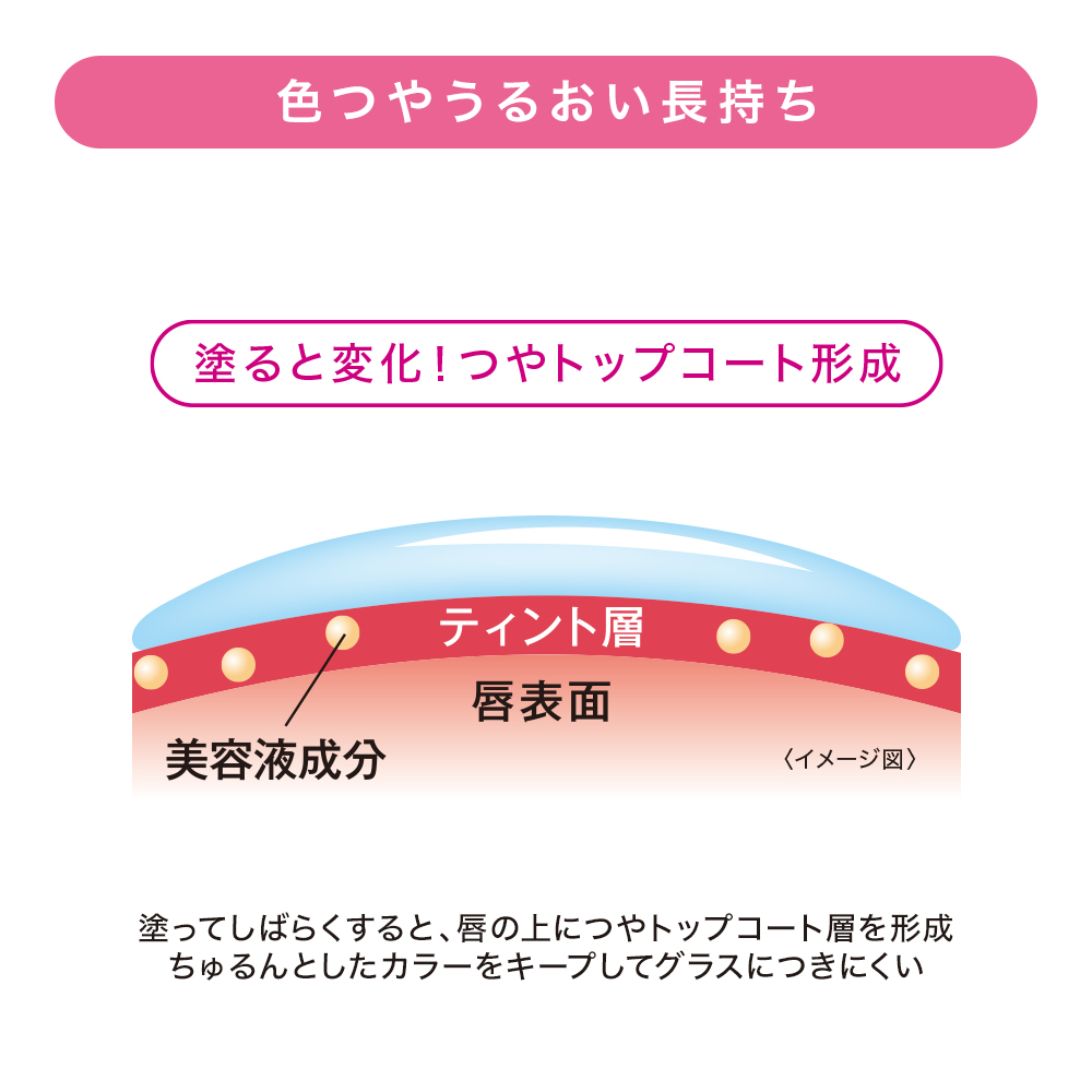 唇の上にできたつやトップコート層が、ちゅるんとしたカラーをキープ。グラスなどにつきにくく、色つや・うるおいが長持ちします。