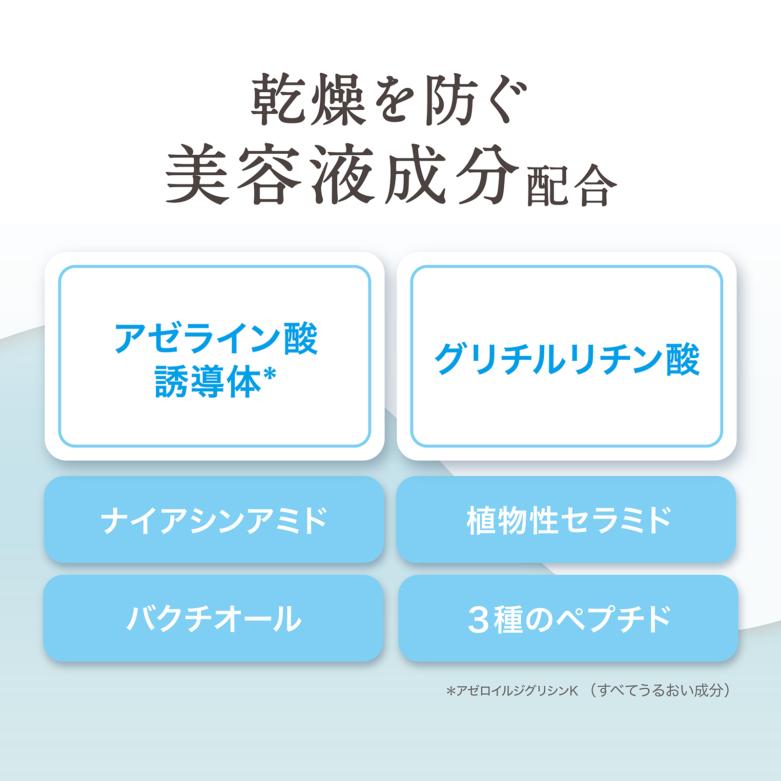 ■アゼライン酸誘導体(※1)・グリチルリチン酸・ナイアシンアミド・バクチオール・植物性セラミド・3種のペプチド配合(すべてうるおい成分)