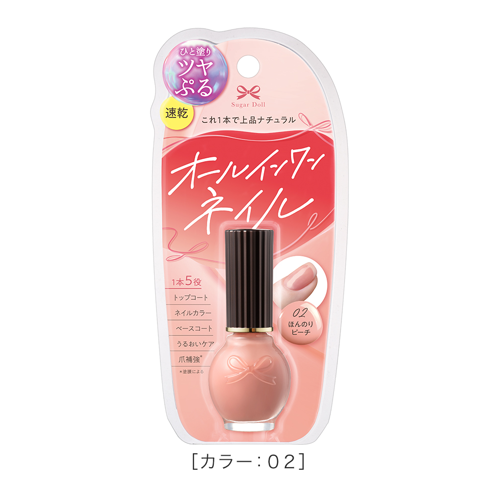 ベースコート・ネイルカラー・トップコート・うるおいケア・爪補強(※1)の1本5機能の速乾オールインワンネイル。